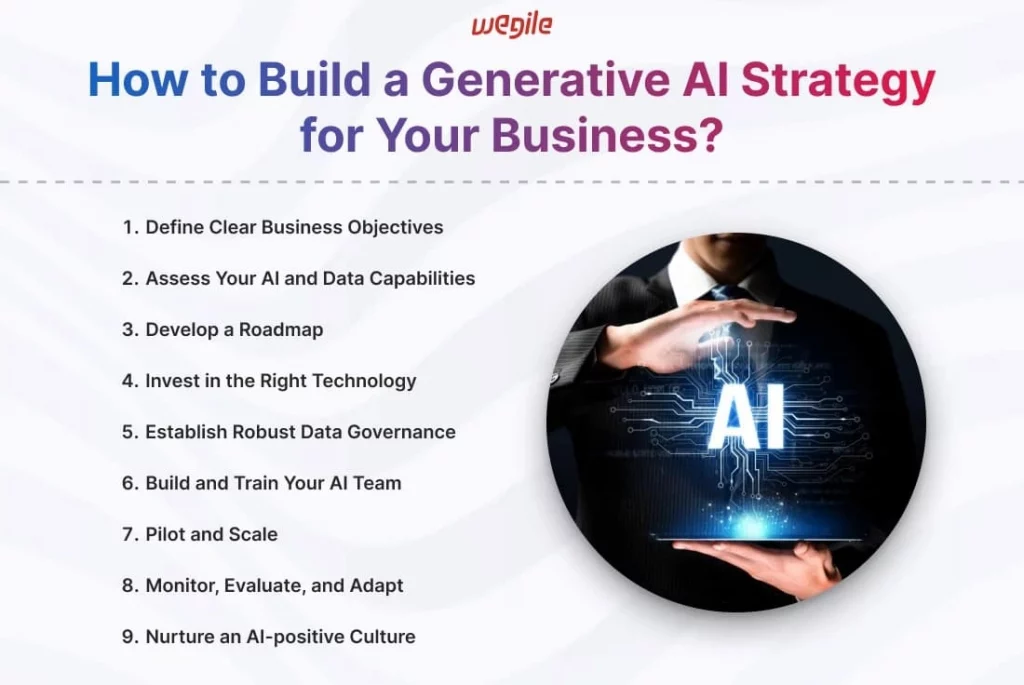Crafting a generative AI strategy for your business involves careful planning and strategic execution to guarantee that AI initiatives match your company’s goals and bring meaningful outcomes. Here’s a comprehensive guide on how to develop a generative AI strategy: