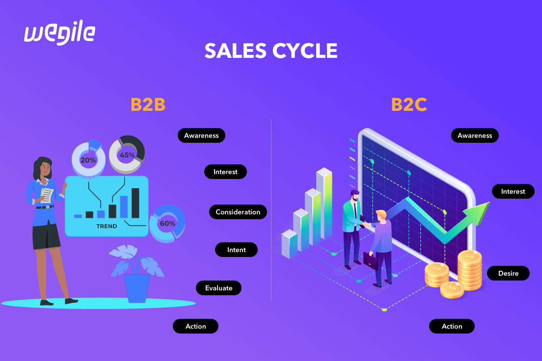 differentiated by the length of time each type takes to complete.B2B sales cycles are normally longer than B2C sales cycles because businesses have a more
